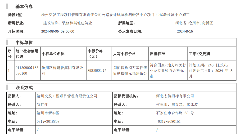 滄州交發(fā)工程項目管理有限責任公司公路設計試驗檢測研發(fā)中心項目 4#試驗檢測 中心施工中標結果公示
